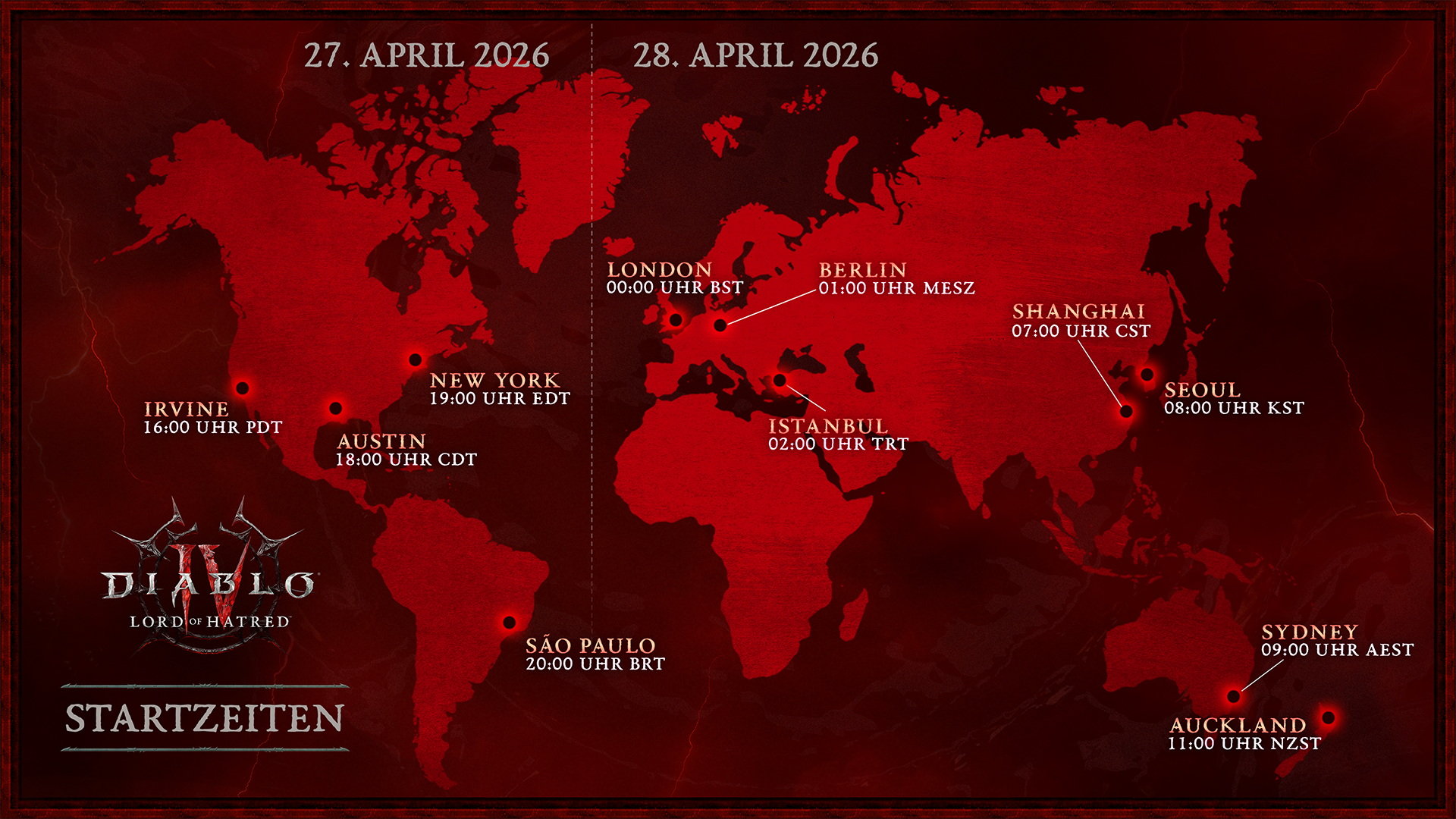 Zusätzlich zu dem Livestream veröffentlichte Blizzard gestern auch noch einen umfangreichen Blogeintrag zu „Lord of Hatred“. Diese Übersicht fasst noch einmal alle Informationen aus dem Livestream zusammen und fungiert somit als praktische Übersicht. Gleichzeitig beinhaltet er eine Reihe von Informationen darüber, wie die Entwickler die Erweiterung eigentlich veröffentlichen möchten. Dadurch wurde enthüllt, dass letzte Nacht um 1:00 Uhr MESZ der Pre-Download für die Erweiterung gestartet ist. Die Freischaltung des eigentlichen Addons steht in Deutschland dann am 28. April 2026 um 01:00 Uhr an.