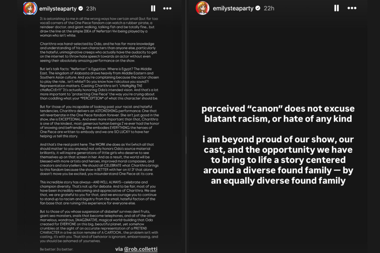 Die Kollegen von Charithra Chandran haben sich bereits offen an die Seite der Schauspielerin gestellt und die Besetzung verteidigt. Emily Rudd (Nami) betonte auf Instagram, dass ein „eingebildeter Kanon“ weder Hass noch Rassismus entschuldigt. Rob Colletti (Wapol) erklärte in einem von Rudd geteilten Beitrag, dass Eiichiro Oda selbst entschieden hat, Charithra Chandran für die Rolle als Vivi anzuheuern. Sie entspricht also scheinbar genau seiner Vorstellung für die Figur und dieser Umstand alleine sollte den Fans von One Piece ausreichen.