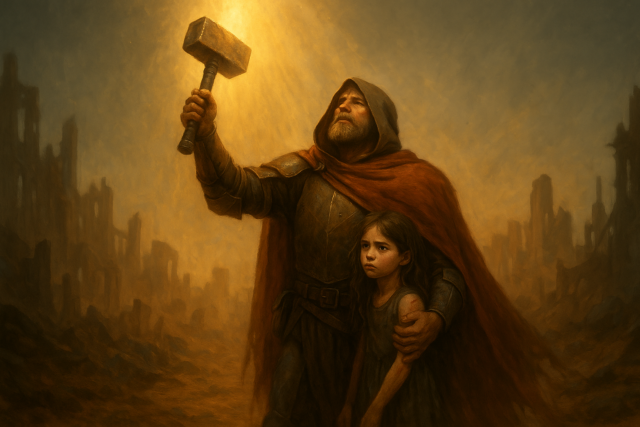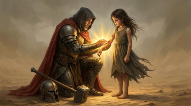 „Der letzte Paladin“ ist ein postapokalyptisches Hörspiel, das der Begegnung zweier Fremder folgt: Ein müder Krieger in vernarbter Rüstung und ein verwaistes Mädchen, das in einer sterbenden Welt mehr Mut zeigt, als es irgendein Kind sollte.