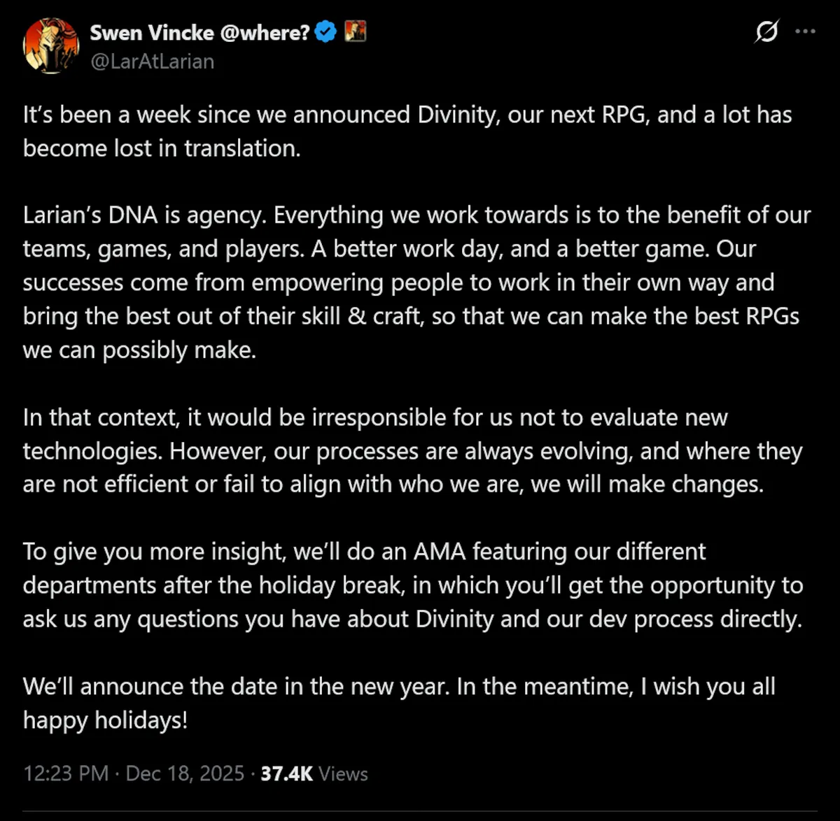 Um diese Situation nun endlich aufzulösen und die Sorgen der Fans zu beruhigen, kündigte Sven Vincke in der vergangenen Nacht eine weitere Maßnahme der Entwickler an. Das Team möchte nach den Feiertagen ein umfangreiches AMA (Ask me Anything) mit Mitgliedern von allen Abteilungen von Larian Studios veranstalten. Während dieser Fragerunde können die Spieler sich direkt an die Entwickler wenden und Informationen zu allen Aspekten der Entwicklung von „Divinity“ erhalten. Über den AI-Einsatz verärgerte Spieler sind dazu eingeladen, ihre Fragen an die Entwickler in diesem Rahmen zu stellen.